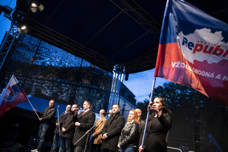 Predstavitelia hnutia Republika počas protivládneho protestu za predčasné voľby a za efektívny boj so zdražovaním, ktorý organizovala strana Smer - sociálna demokracia pred Prezidentským palácom. Bratislava, 20. september 2022. Foto: SITA/Branislav Bibel