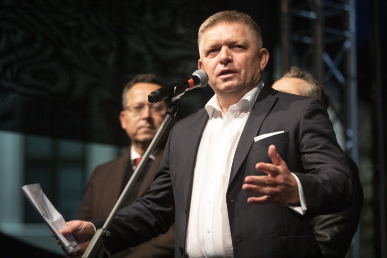 Predseda strany SMER-SD Rober Fico počas protivládneho protestu za predčasné voľby a za efektívny boj so zdražovaním, ktorý organizovala strana Smer - sociálna demokracia pred Prezidentským palácom. Bratislava, 20. september 2022. Foto: SITA/Branislav Bibel