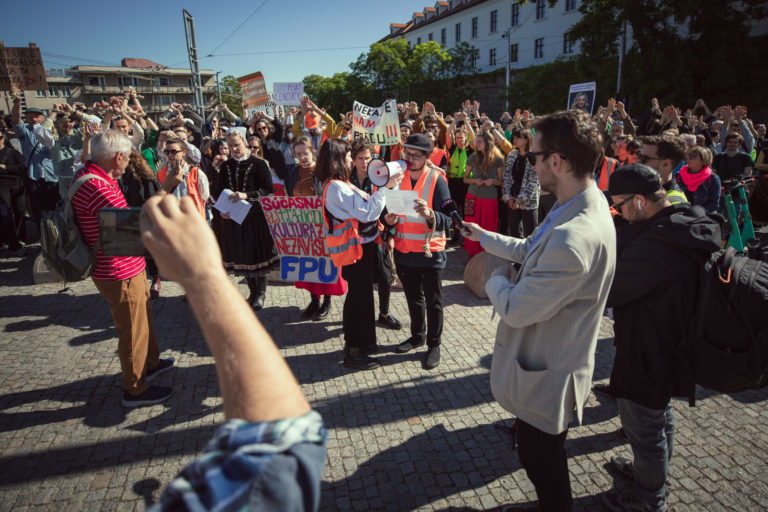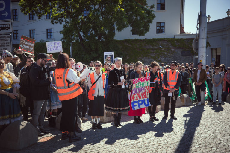 Účastníci z radov umeleckej a kultúrnej obce, členstva komisií FPU a odbornej verejnosti vyjadrujú počas protestu pred NR SR svoj nesúhlas s kontroverznou novelou zákona o Fonde na podporu umenia (FPU) pred začatím 12. schôdze Národnej rady SR, na ktorej sa má o nej hlasovať. Bratislava 14. mája 2024. Foto: SITA/Diana Černák
