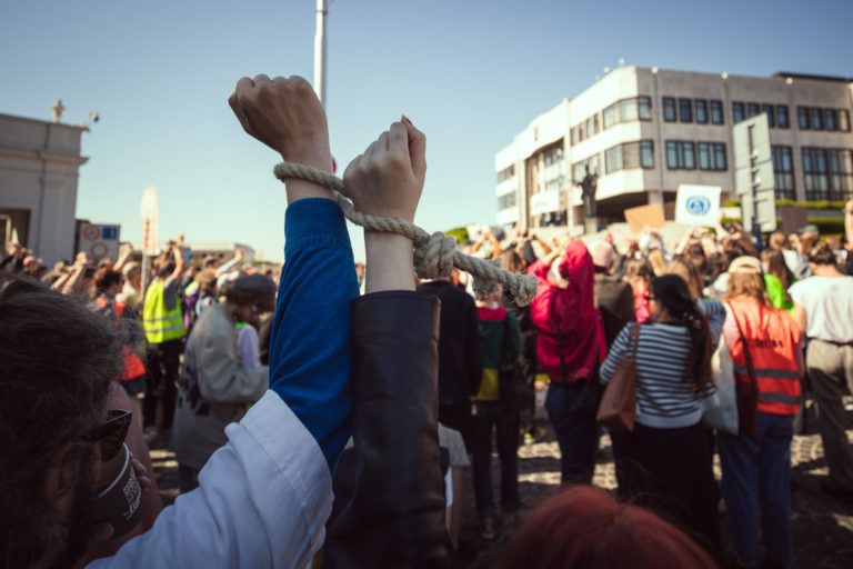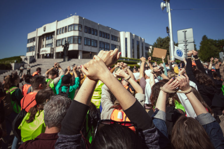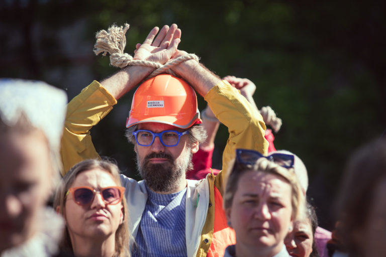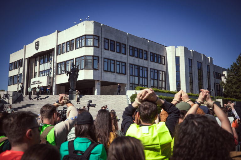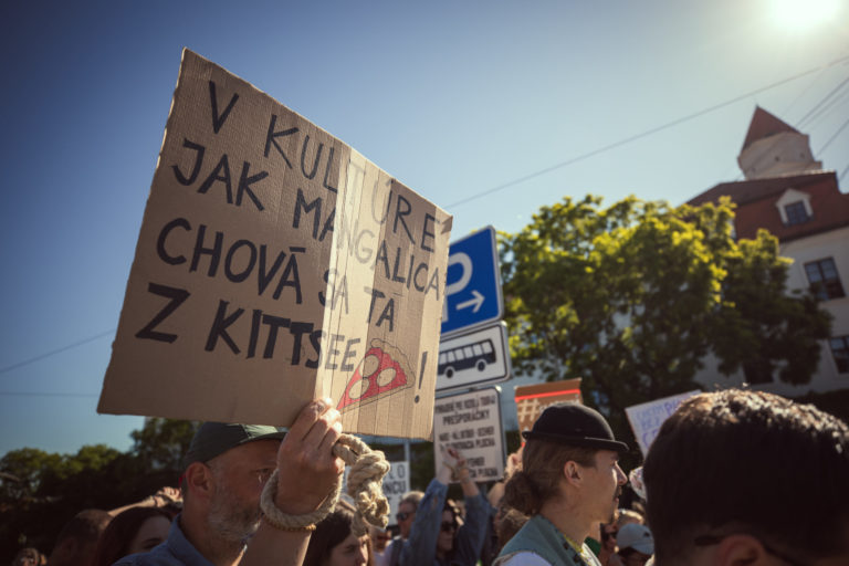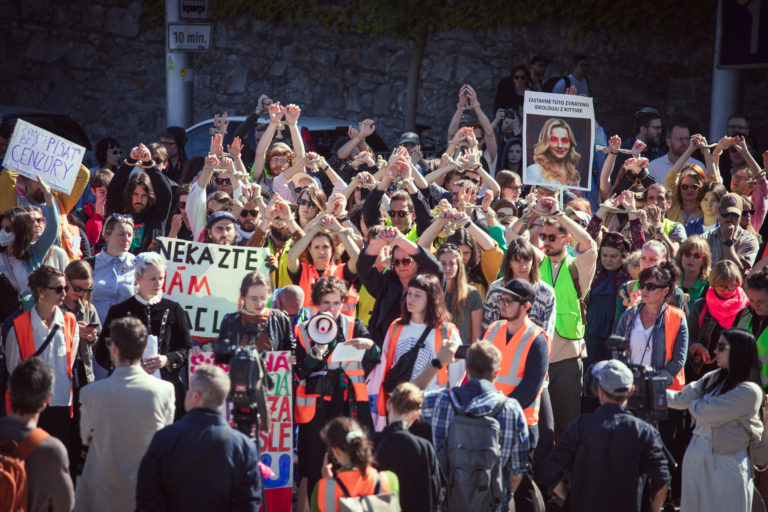 Účastníci z radov umeleckej a kultúrnej obce, členstva komisií FPU a odbornej verejnosti vyjadrujú počas protestu pred NR SR svoj nesúhlas s kontroverznou novelou zákona o Fonde na podporu umenia (FPU) pred začatím 12. schôdze Národnej rady SR, na ktorej sa má o nej hlasovať. Bratislava, 14. máj 2024. Foto: SITA/Diana Černák