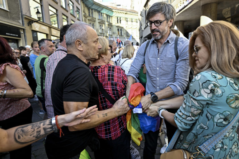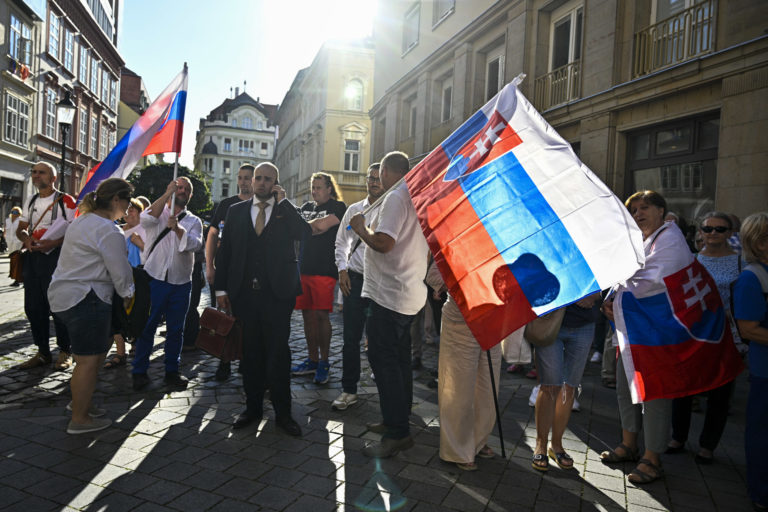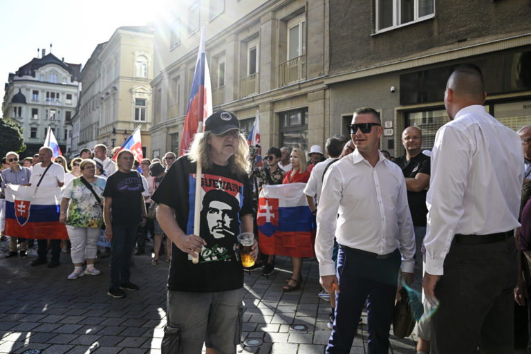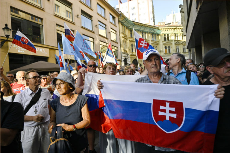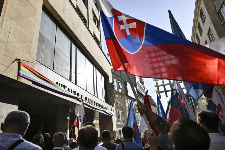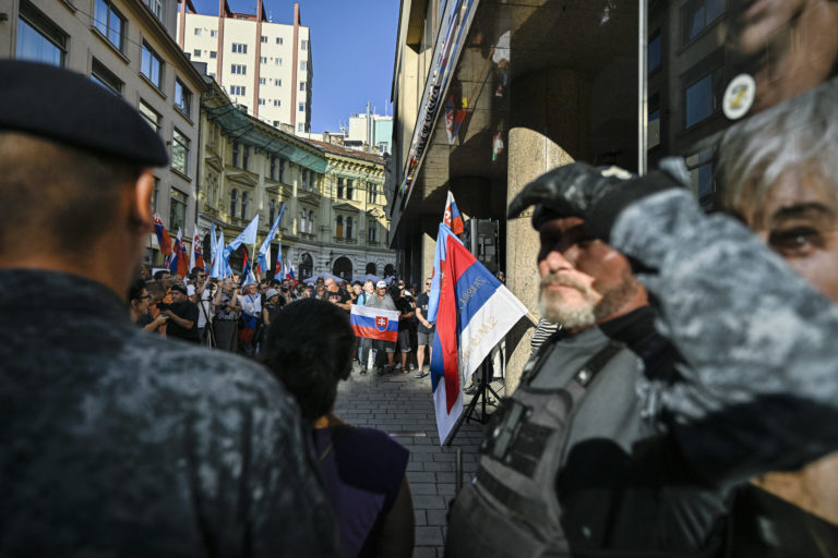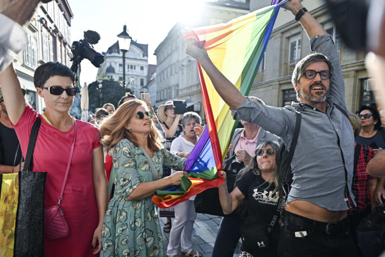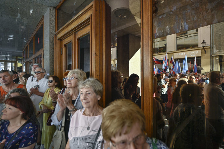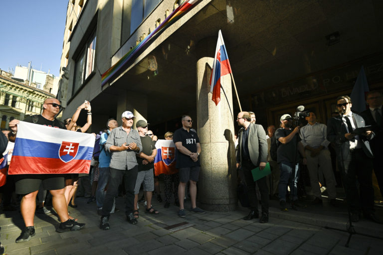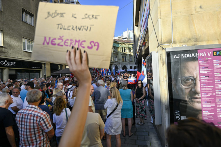 Atmosféra počas občianskeho protestu Matice slovenskej pred divadlom, proti aktuálnej reklamnej kampani bratislavského Divadla Pavla Országha Hviezdoslava na novú divadelnú sezónu. Bratislava 6. september 2023. Foto: SITA/Milan Illík