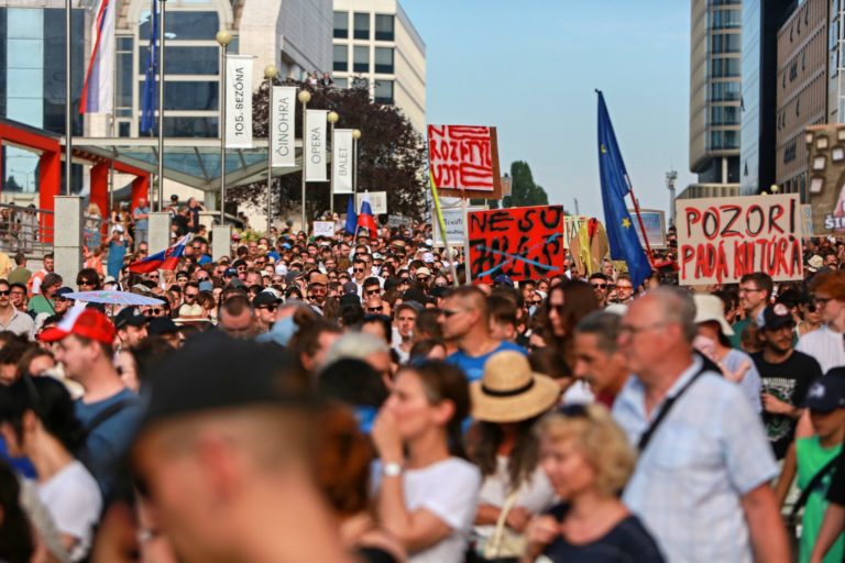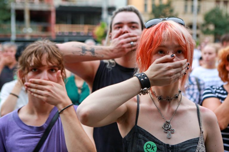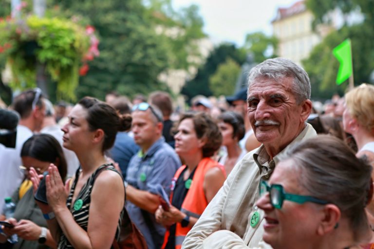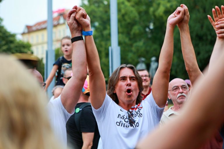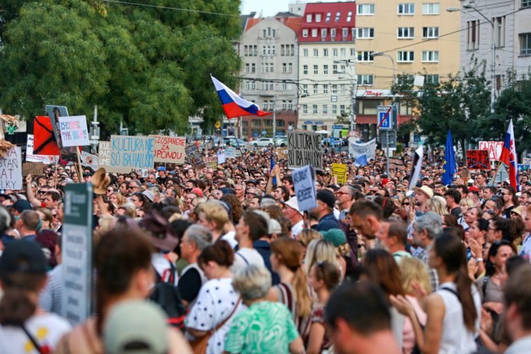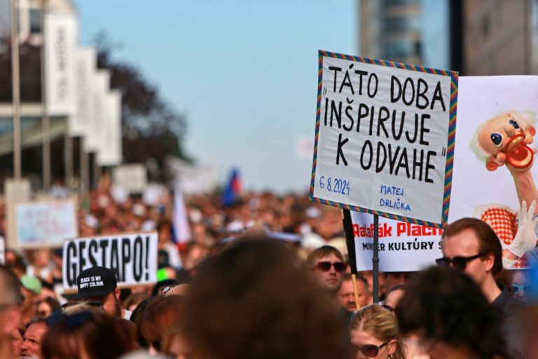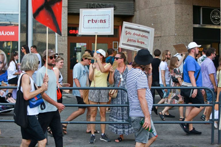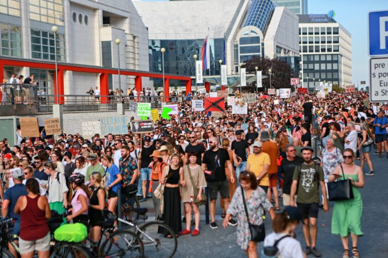 Atmosféra počas pochodu v rámci protestu na obranu kultúry na Námestí SNP. Bratislava, 12. august 2024. Foto: SITA/Tomáš Susko