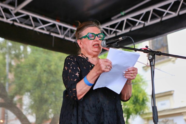 Herečka Zuzana Krónerová počas protestu na obranu kultúry na Námestí SNP. Slobodný hlas slovenskej kultúry hovorí NIE praktikám Ministerstva kultúry SR. Bratislava, 12. august 2024. Foto: SITA/Tomáš Suskov