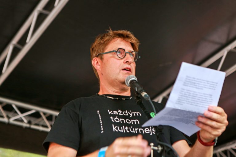 Matej Drlička počas protestu na obranu kultúry na Námestí SNP. Slobodný hlas slovenskej kultúry hovorí NIE praktikám Ministerstva kultúry SR. Bratislava, 12. august 2024. Foto: SITA/Tomáš Susko