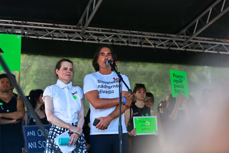 Herci SND Martin Huba a Zuzana Krónerová počas protestu na obranu kultúry na Námestí SNP. Slobodný hlas slovenskej kultúry hovorí NIE praktikám Ministerstva kultúry SR. Bratislava, 12. august 2024. Foto: SITA/Tomáš Susko