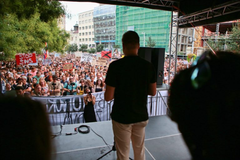 Atomsféra počas pochodu na obranu kultúry od novej budovy SND na Námestie SNP. Bratislava, 12. august 2024. Foto: SITA/Tomáš Susko