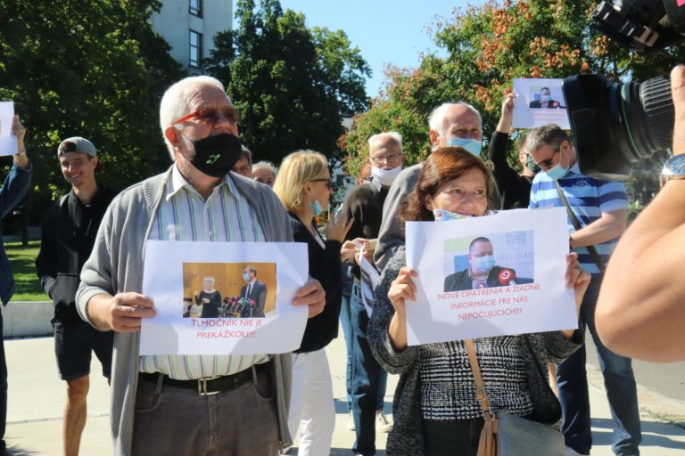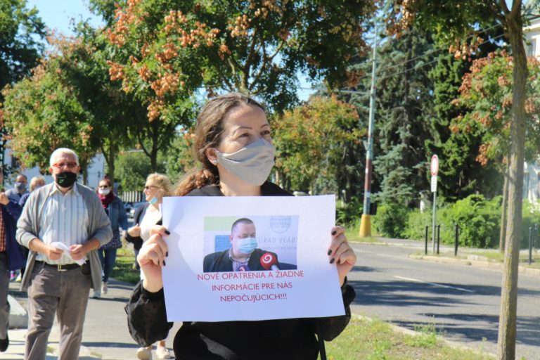 Atmosféra pred Úradom vlády (ÚV) SR počas protestu nepočujúcich za obnovenie tlmočenia do slovenského posunkového jazyka na tlačových konferenciách, alebo brífingoch a aby sa urýchlil proces vyplatenia tlmočníkov za vykonanú prácu od začiatku tlmočenia na ÚV SR v súvislosti s COVID-19. Bratislava, 2. september 2020. Foto: SITA/Alexandra Čunderlíková