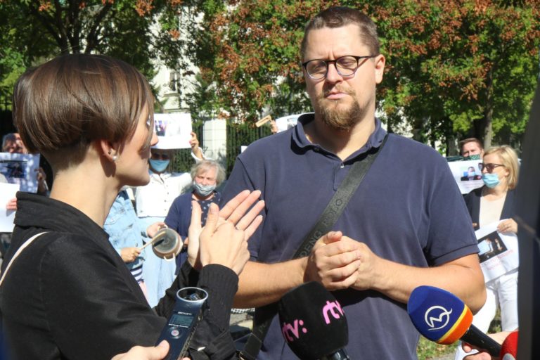 Zľava: Účastníčka protestu a tlmočníčka Barbara Randušková a predseda Slovenského zväzu nepočujúcich Jaroslav Cehlárik počas vyjadrenia v rámci protestu nepočujúcich za obnovenie tlmočenia do slovenského posunkového jazyka na tlačových konferenciách, alebo brífingoch a aby sa urýchlil proces vyplatenia tlmočníkov za vykonanú prácu od začiatku tlmočenia na ÚV SR v súvislosti s COVID-19. Bratislava, 2. september 2020. Foto: SITA/Alexandra Čunderlíková