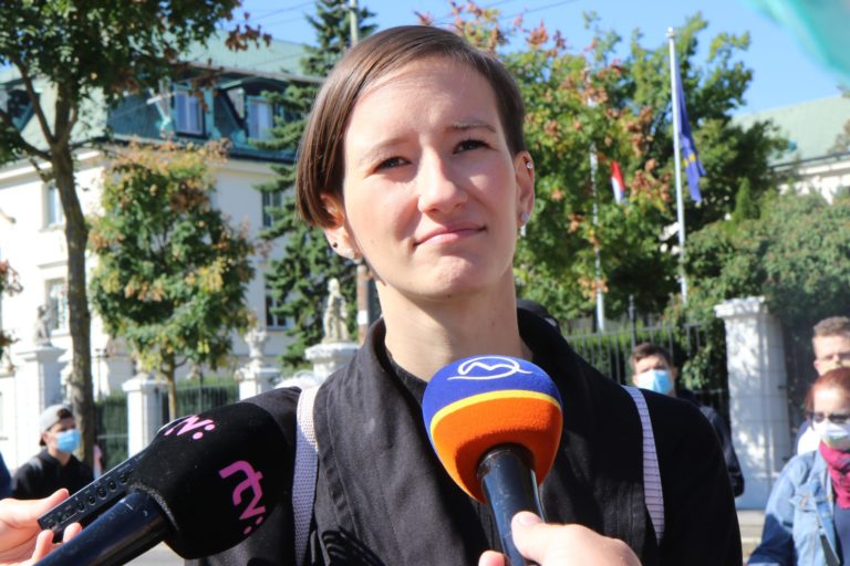Účastníčka protestu a tlmočníčka Barbara Randušková počas vyjadrenia v rámci protestu nepočujúcich pred Úradom vlády (ÚV) SR za obnovenie tlmočenia do slovenského posunkového jazyka na tlačových konferenciách, alebo brífingoch a aby sa urýchlil proces vyplatenia tlmočníkov za vykonanú prácu od začiatku tlmočenia na ÚV SR v súvislosti s COVID-19. Bratislava, 2. september 2020. Foto: SITA/Alexandra Čunderlíková