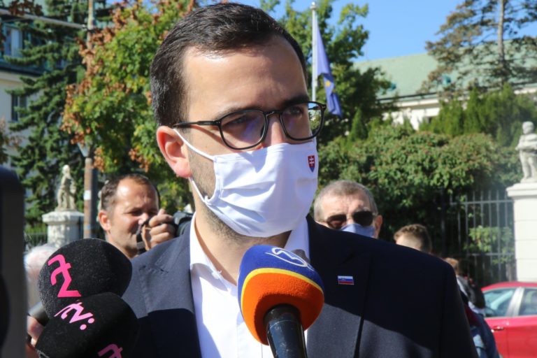 Vedúci Úradu vlády SR Július Jakab počas vyjadrenia v rámci protestu nepočujúcich za obnovenie tlmočenia do slovenského posunkového jazyka na tlačových konferenciách, alebo brífingoch a aby sa urýchlil proces vyplatenia tlmočníkov za vykonanú prácu od začiatku tlmočenia na ÚV SR v súvislosti s COVID-19. Bratislava, 2. september 2020. Foto: SITA/Alexandra Čunderlíková