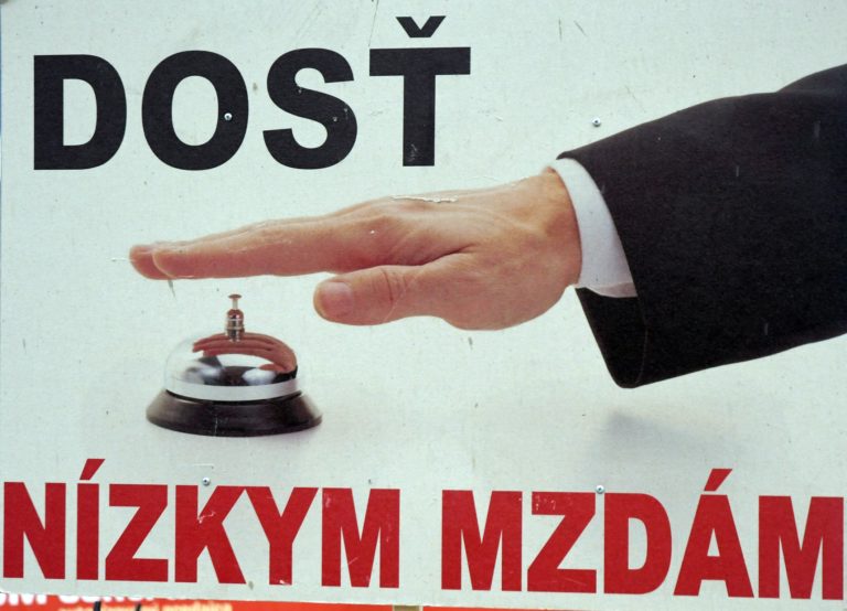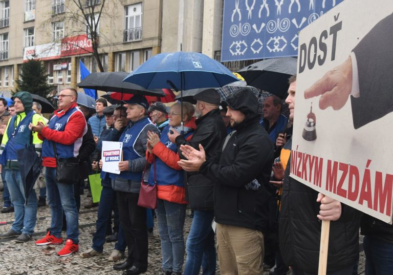Transparent počas protestného zhromaždenia Odborového zväzu (OZ) KOVO pred Odborovým domom kultúry v Prešove na podporu rastu miezd na Slovensku. Prešov, 7. november 2019. Foto: SITA/Viktor Zamborský