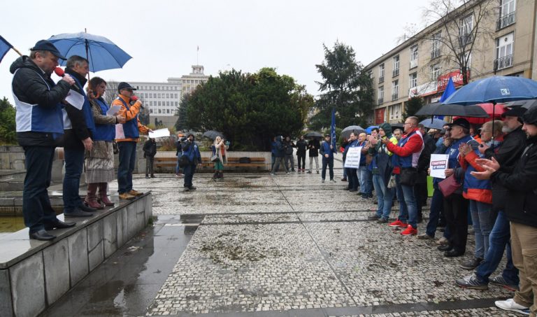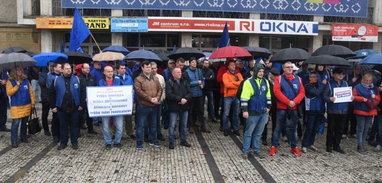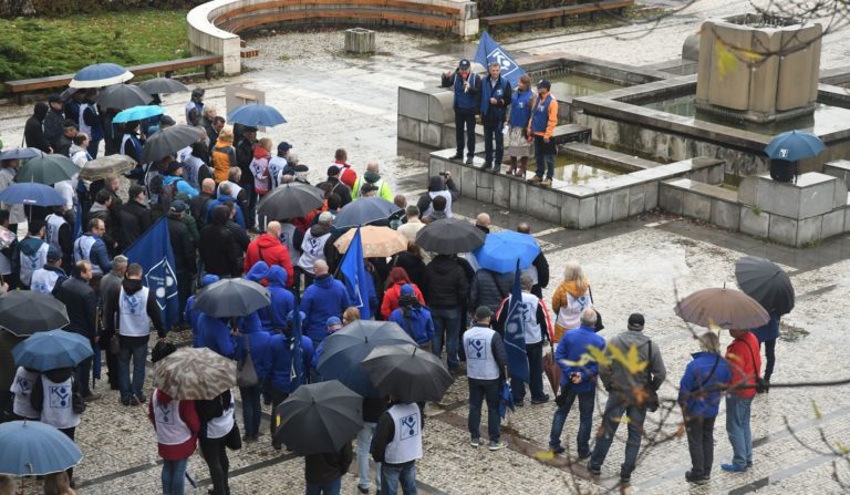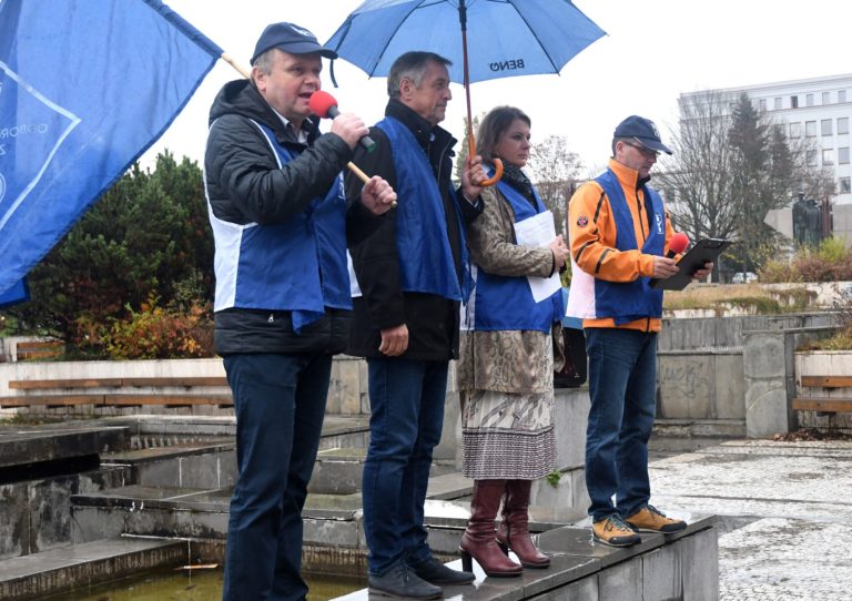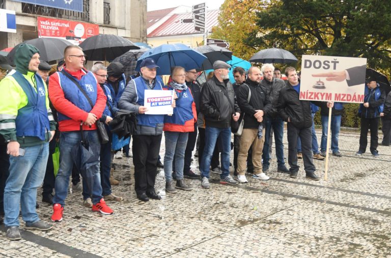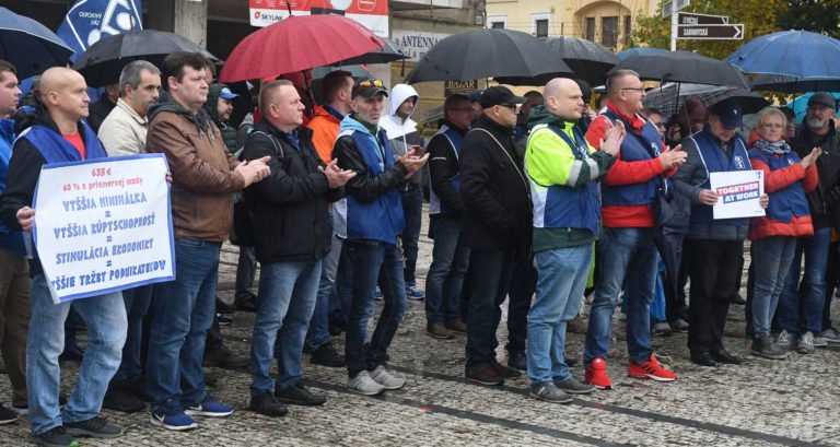 Odborári počas protestného zhromaždenia Odborového zväzu (OZ) KOVO pred Odborovým domom kultúry v Prešove na podporu rastu miezd na Slovensku. Prešov, 7. november 2019. Foto: SITA/Viktor Zamborský