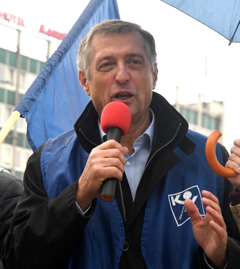 Predseda Rady OZ KOVO Emil Machyna počas protestného zhromaždenia Odborového zväzu (OZ) KOVO pred Odborovým domom kultúry v Prešove na podporu rastu miezd na Slovensku. Prešov, 7. november 2019. Foto: SITA/Viktor Zamborský