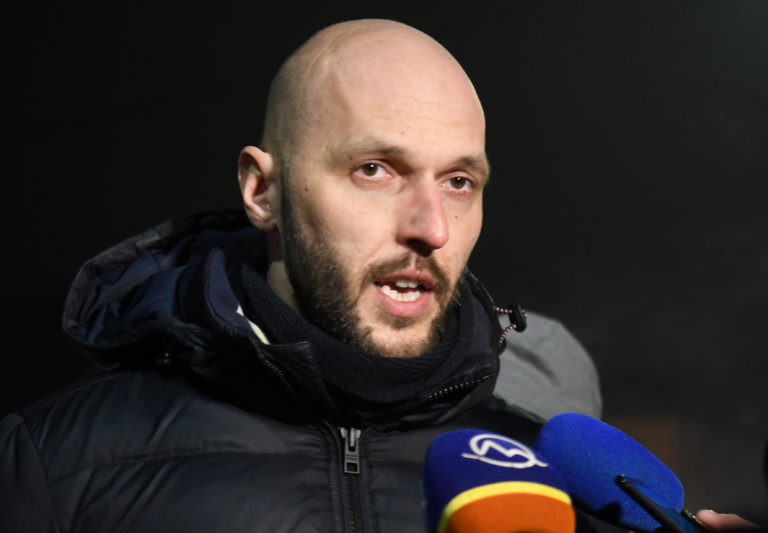 Predseda hnutia PS Michal Truban odpovedá na otázky médií počas protestu s názvom Postavme sa nenávisti a extrémistom, alebo Nenechávajme Kotlebovcov samých, ktorý organizuje hnutie PS a strana SPOLU v Sabinove. Sabinov, 15. január 2020. Foto: SITA/PS/SPOLU