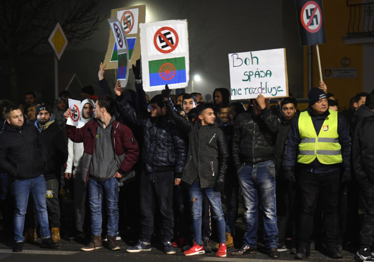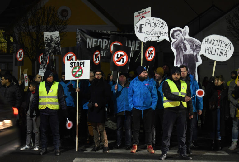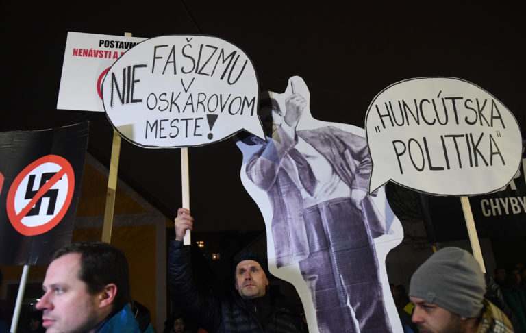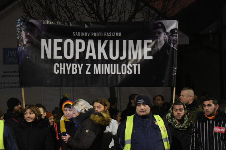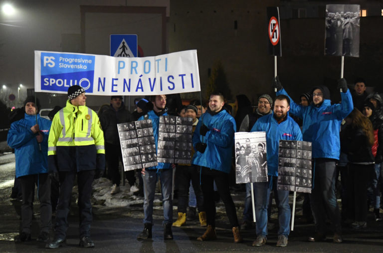 Účastníci s transparentom počas protestu s názvom Postavme sa nenávisti a extrémistom, alebo Nenechávajme Kotlebovcov samých, ktorý organizuje hnutie PS a strana SPOLU v Sabinove. Sabinov, 15. január 2020. Foto: SITA/PS/SPOLU
