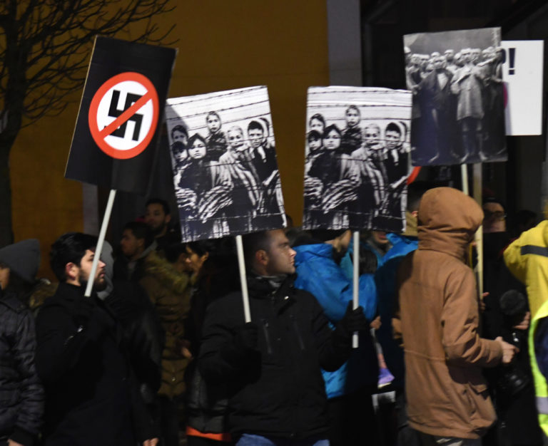 Účastníci s transparentmi počas protestu s názvom Postavme sa nenávisti a extrémistom, alebo Nenechávajme Kotlebovcov samých, ktorý organizuje hnutie PS a strana SPOLU v Sabinove. Sabinov, 15. január 2020. Foto: SITA/PS/SPOLU