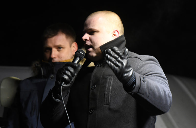 Člen strany Kotlebovci - ¼S NS Milan Mazurek počas príhovoru v rámci mítingu strany Kotlebovci - ¼udová strana Naše Slovensko (¼S NS) v Sabinove. Reakciou na míting strany Kotlebovci - ¼S NS sa stal proteste s názvom Postavme sa nenávisti a extrémistom, alebo Nenechávajme Kotlebovcov samých, ktorý organizuje hnutie PS a strana SPOLU v Sabinove. Sabinov, 15. január 2020. Foto: SITA/PS/SPOLU