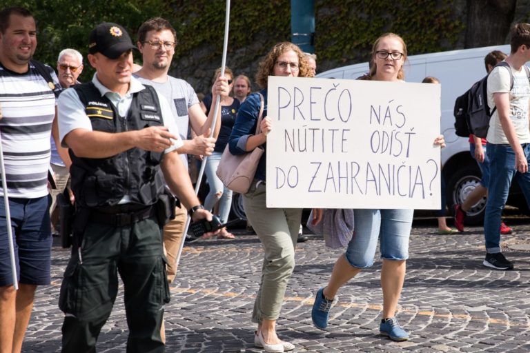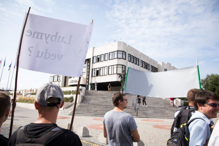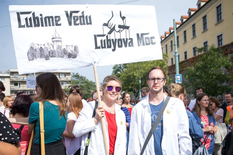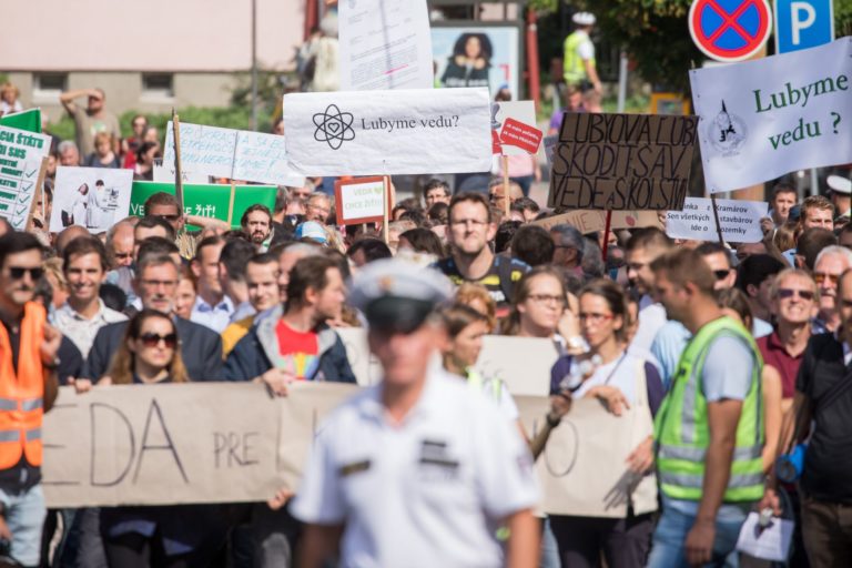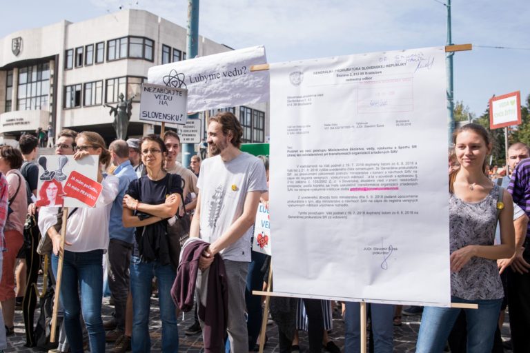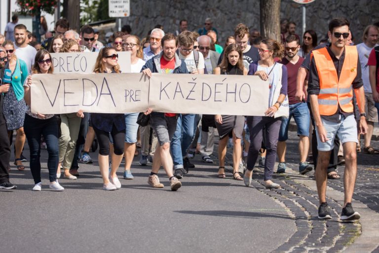 Protestujúci vedci s transparentmi počas pochodu zorganizovaného iniciatívou Veda chce žiť z Námestia slobody k budove Národnej rady SR s cieľom upozorniť poslancov, že osud SAV je v ich rukách. Bratislava, 11. september 2018. Foto: SITA/Diana Černáková
