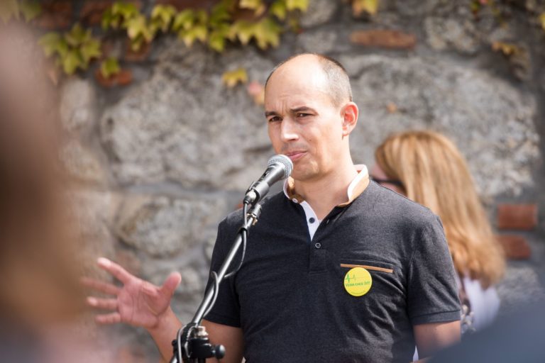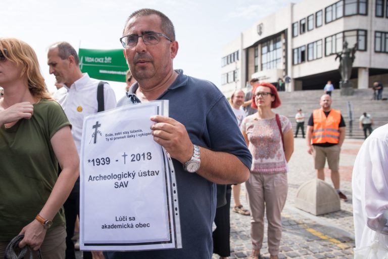 Člen SAV a iniciatívy Veda chce žiť Miloslav Bahna počas príhovorov po pochode organizovaného iniciatívou Veda chce žiť pri budove Národnej rady SR s cieľom upozorniť poslancov, že osud SAV je v ich rukách. Bratislava, 11. september 2018. Foto: SITA/Diana Černáková