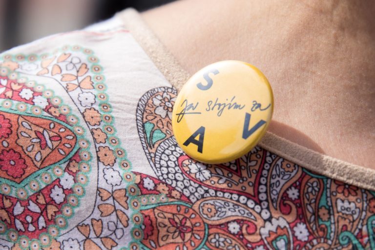 Odznak protestujúceho vedca počas príhovorov po pochode organizovaného iniciatívou Veda chce žiť pri budove Národnej rady SR s cieľom upozorniť poslancov, že osud SAV je v ich rukách. Bratislava, 11. september 2018. Foto: SITA/Diana Černáková