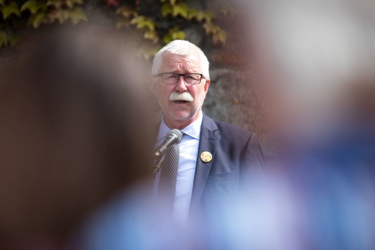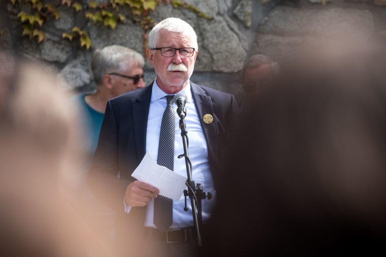 Predseda SAV Pavol Šajgalík počas príhovorov po pochode zorganizovaného iniciatívou Veda chce žiť pri budove Národnej rady SR s cieľom upozorniť poslancov, že osud SAV je v ich rukách. Bratislava, 11. september 2018. Foto: SITA/Diana Černáková