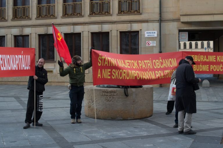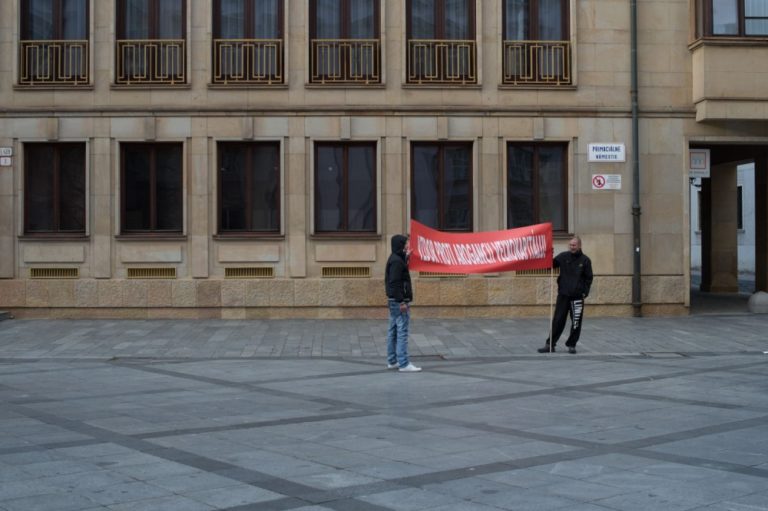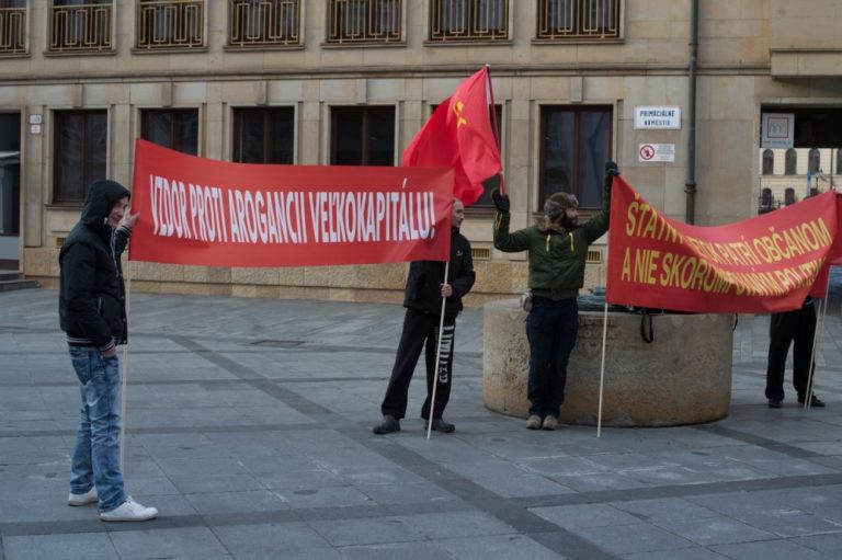 Účastníci protestu proti búraniu PKO. Protest je organizovaný stranou práce - Vzdor pred Magistrátom hlavného mesta SR na Primaciálnom námestí. Bratislava, 16. január 2016. Foto: SITA/Robert Tappert