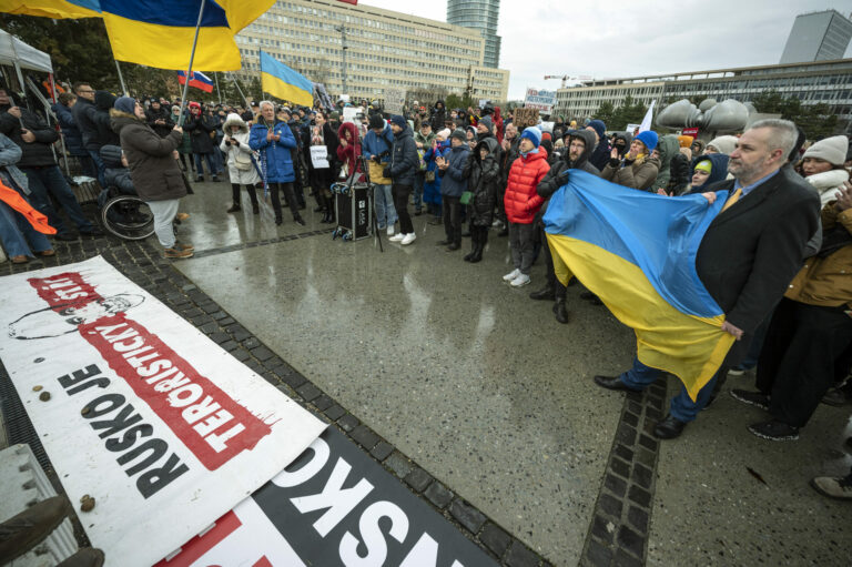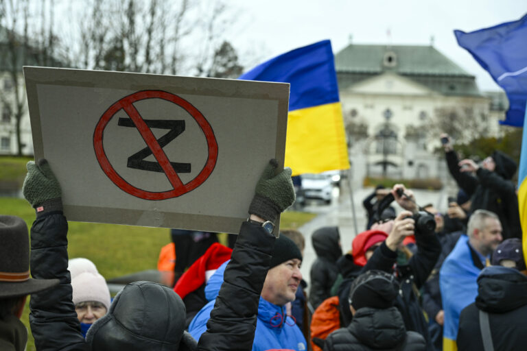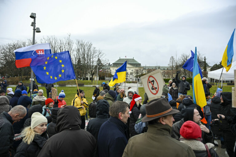Účastníci počas protestu občianskeho združenia Mier Ukrajine s názvom Dosť bolo Ruska proti konaniu premiéra Fica, ktorý Putinovi nechutne podkladá Slovensko na tácke ako nejaký vianočný darček na Námestí slobody pred Úradom vlády SR v Bratislave. Bratislava, 23. december 2024. Foto: SITA/Milan Illík