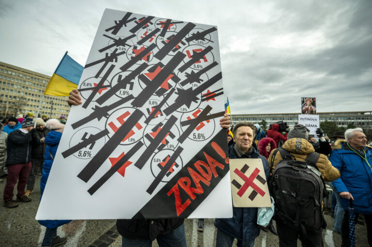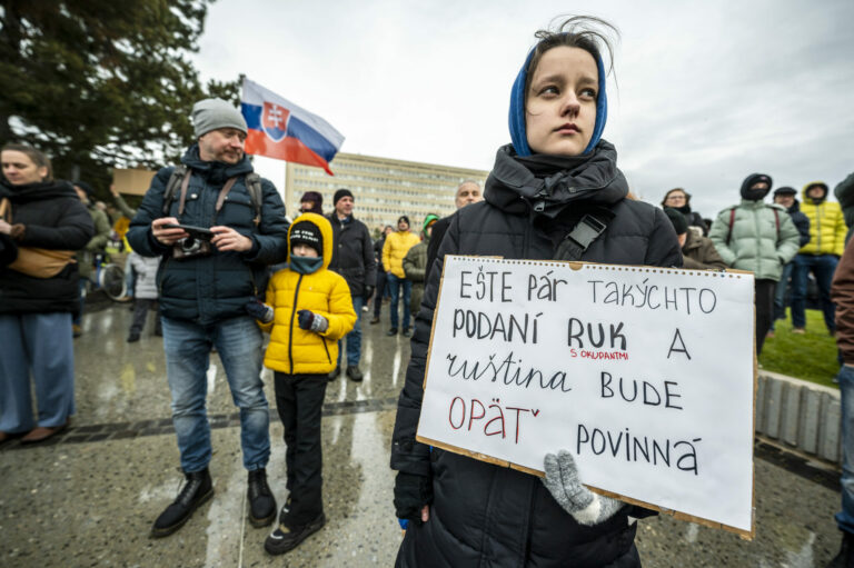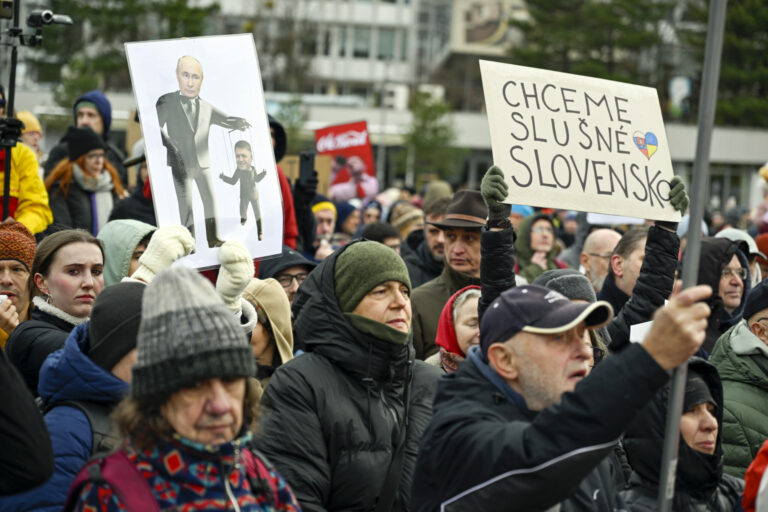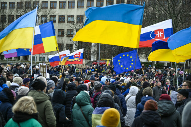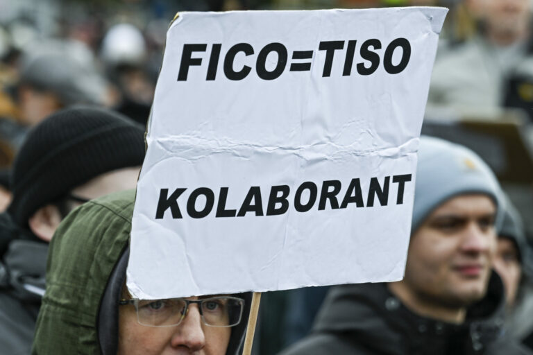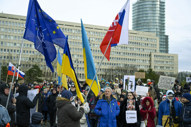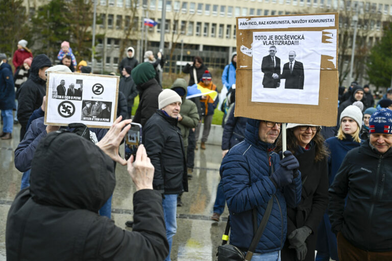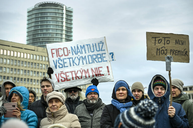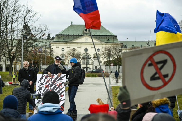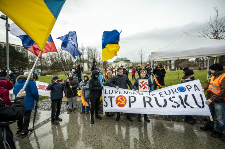 Účastníci s transparentami počas protestu občianskeho združenia Mier Ukrajine s názvom Dosť bolo Ruska proti konaniu premiéra Fica, ktorý Putinovi nechutne podkladá Slovensko na tácke ako nejaký vianočný darček na Námestí slobody pred Úradom vlády SR v Bratislave. Bratislava, 23. december 2024. Foto: SITA/Milan Illík
