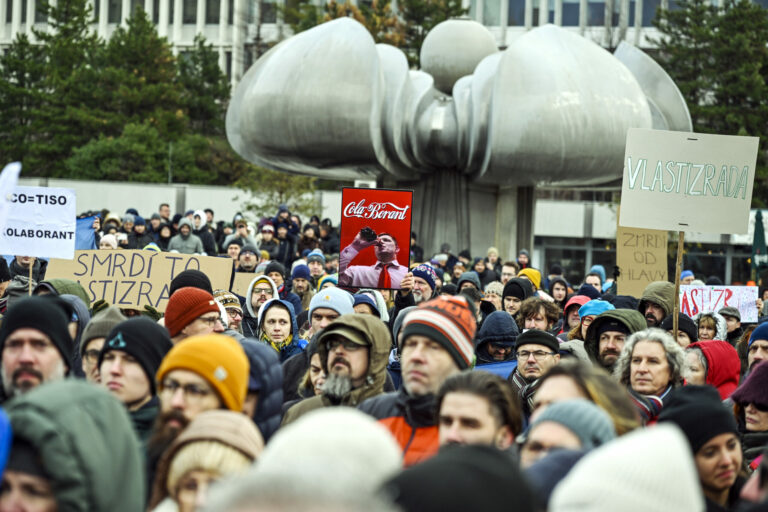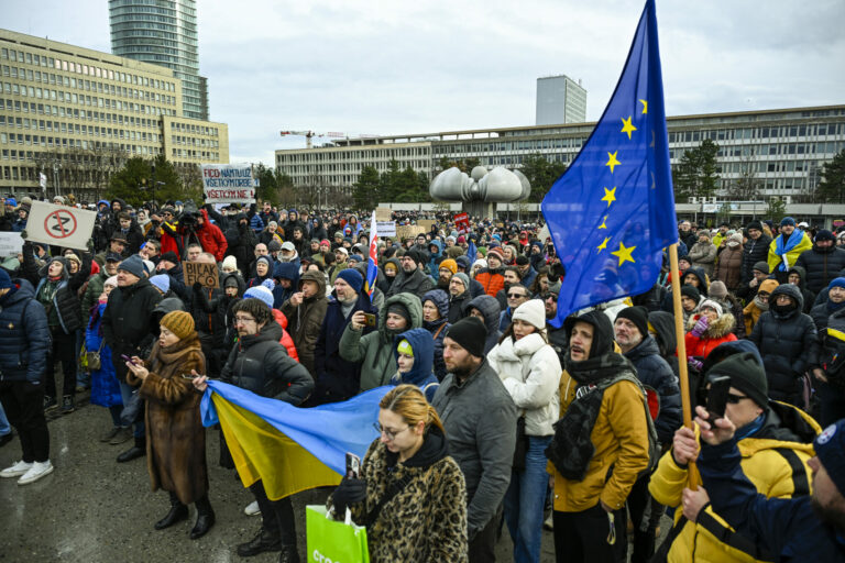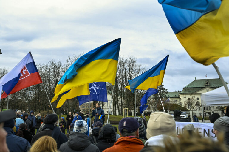 Atmosféra počas protestu občianskeho združenia Mier Ukrajine s názvom Dosť bolo Ruska proti konaniu premiéra Fica, ktorý Putinovi nechutne podkladá Slovensko na tácke ako nejaký vianočný darček na Námestí slobody pred Úradom vlády SR v Bratislave. Bratislava, 23. december 2024. Foto: SITA/Milan Illík