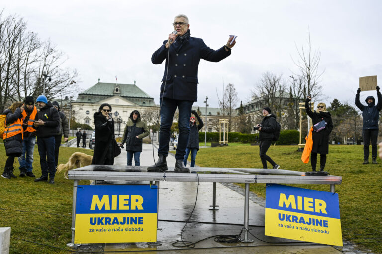 Člen predsedníctva strany Progresívne Slovensko (PS) Ivan Korčok (uprostred) počas protestu občianskeho združenia Mier Ukrajine s názvom Dosť bolo Ruska proti konaniu premiéra Fica, ktorý Putinovi nechutne podkladá Slovensko na tácke ako nejaký vianočný darček na Námestí slobody pred Úradom vlády SR v Bratislave. Bratislava, 23. december 2024. Foto: SITA/Milan Illík