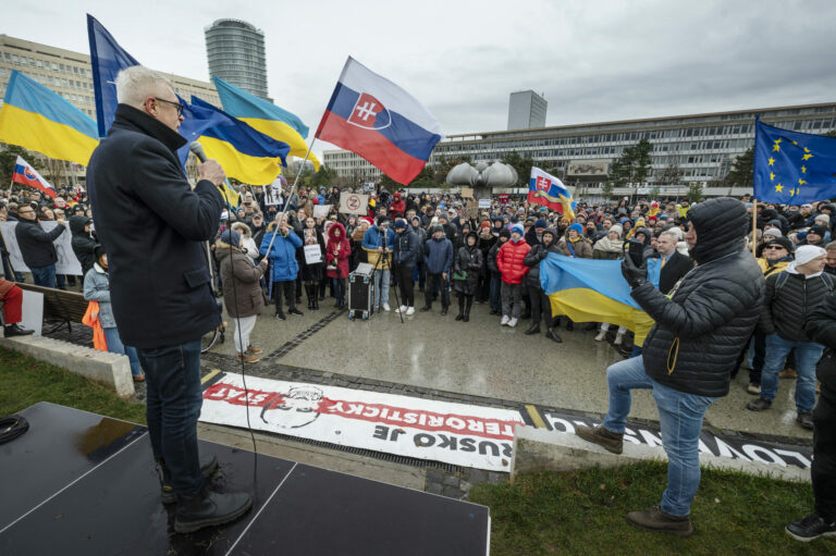 Spisovateľ Michal Hvorecký (uprostred v pozadí) počas protestu občianskeho združenia Mier Ukrajine s názvom Dosť bolo Ruska proti konaniu premiéra Fica, ktorý Putinovi nechutne podkladá Slovensko na tácke ako nejaký vianočný darček na Námestí slobody pred Úradom vlády SR v Bratislave. Bratislava, 23. december 2024. Foto: SITA/Milan Illík