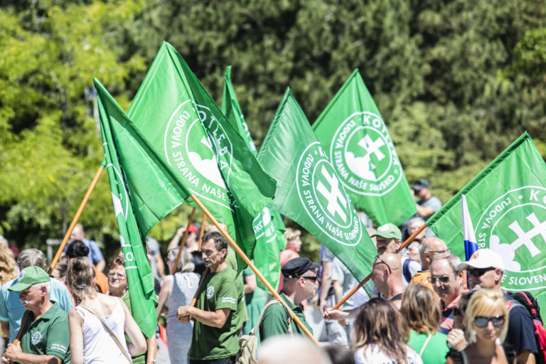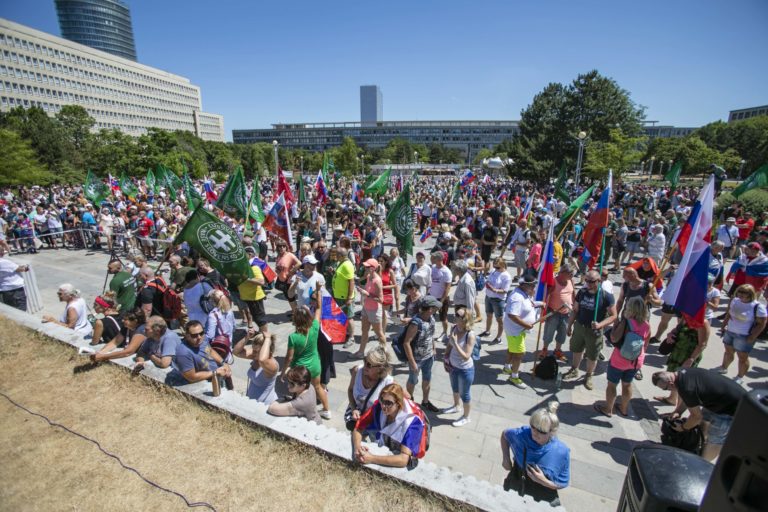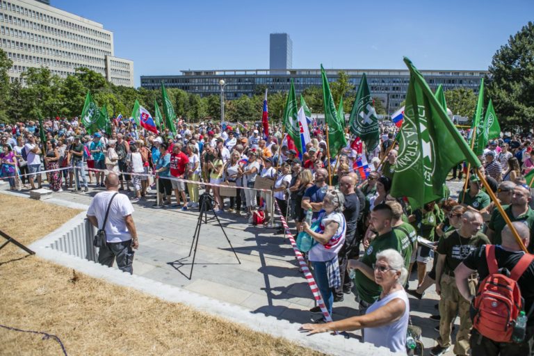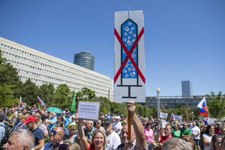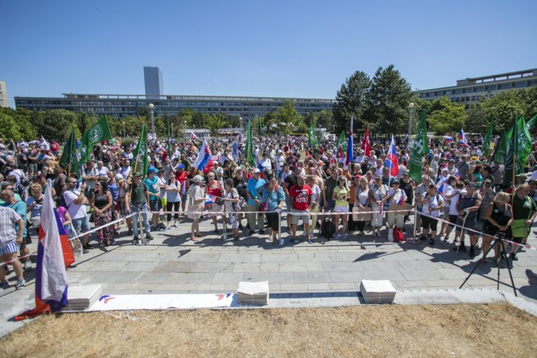Účastníci protestu proti očkovaniu a zotročovaniu Slovenska pred Úradom vlády SR. Bratislava, 10. júl 2021. Foto: SITA/Jana Birošová