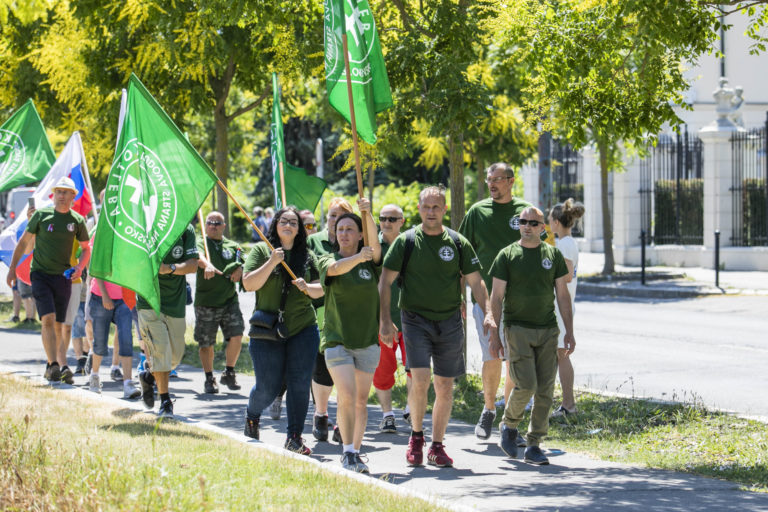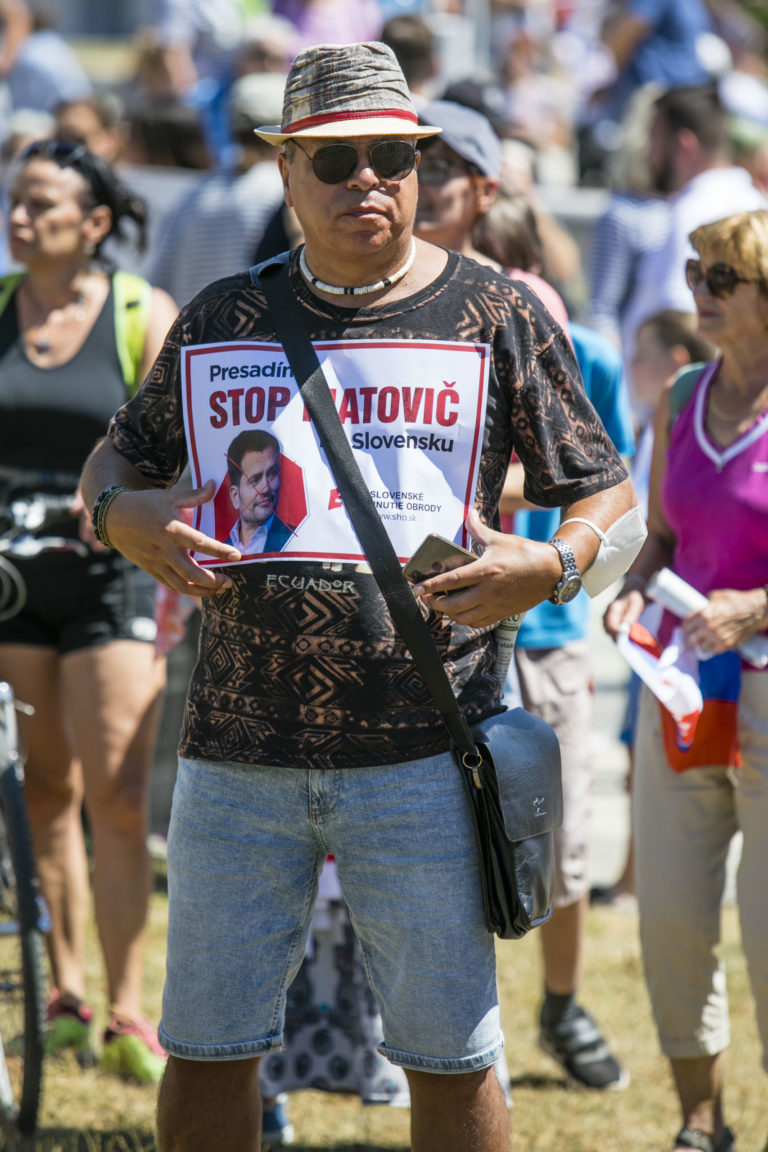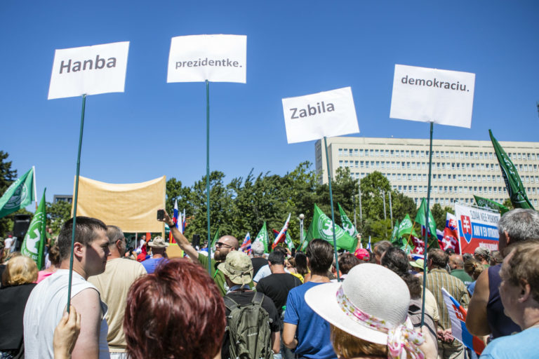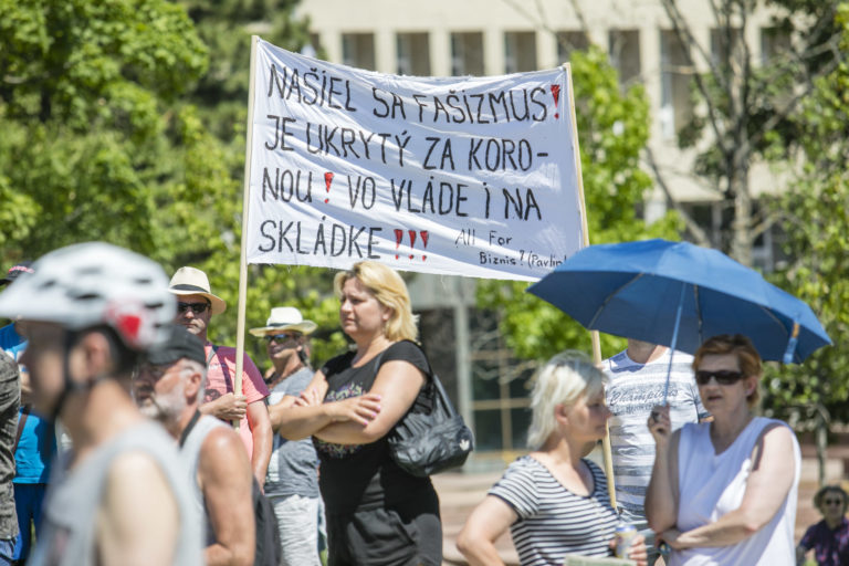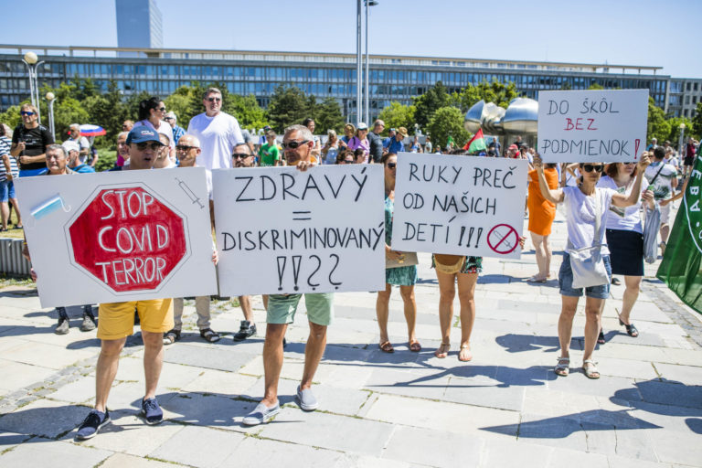 Účastníci počas protestu proti očkovaniu a zotročovaniu Slovenska pred Úradom vlády SR. Bratislava, 10. júl 2021. Foto: SITA/Jana Birošová