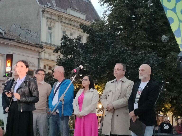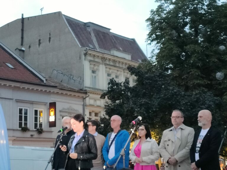 Rečníci a moderátori na proteste proti ožobračovaniu v Košiciach (16. september 2025). Foto: SITA/Katarína Lörincová.