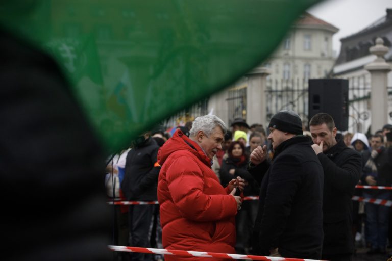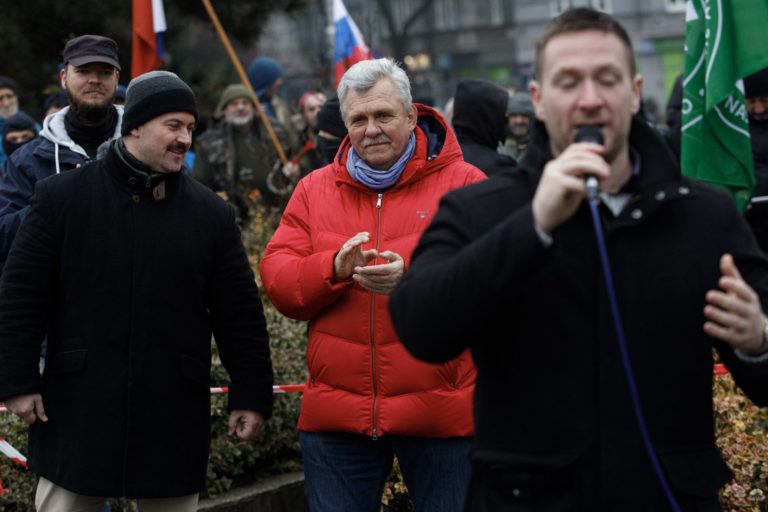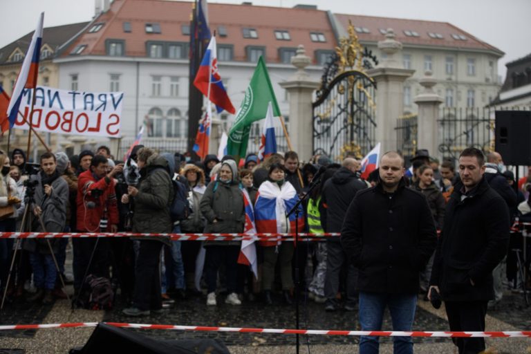 Sprava v popredí: Poslanec EP Milan Uhrík a poslanec NR SR za stranu ĽSNS Milan Mazurek počas protestu organizovaného stranou Kotlebovci – Ľudová strana Naše Slovensko (ĽSNS) proti vláde Igora Matoviča a protiepidemiologickým opatreniam v súvislosti s COVID-19 pred Prezidentským palácom. Bratislava, 12. december 2020. Foto: SITA/Branislav Bibel