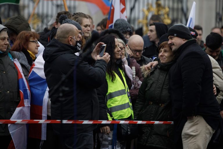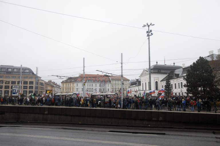 Účastníci počas protestu organizovaného stranou Kotlebovci – Ľudová strana Naše Slovensko (ĽSNS) proti vláde Igora Matoviča a protiepidemiologickým opatreniam v súvislosti s ochorením COVID-19 pred Prezidentským palácom. Bratislava, 12. december 2020. Foto: SITA/Branislav Bibel