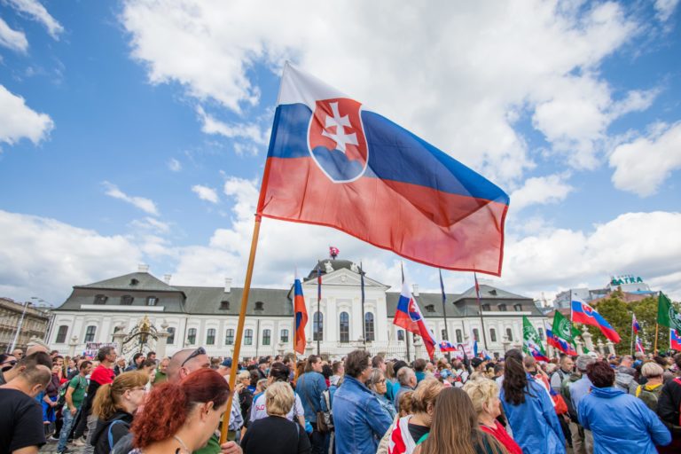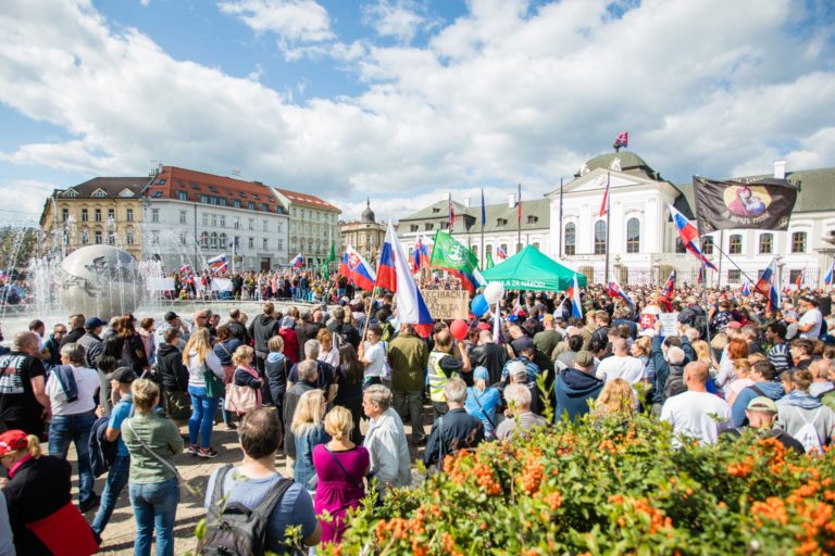 Účastníci počas protestu proti vláde, prezidentke SR a opatreniam v súvislosti s COVID-19 pred Prezidentským palácom SR pri príležitosti štátneho sviatku Dňa Ústavy SR. Bratislava, 1. september 2021. Foto: SITA/Jana Birošová