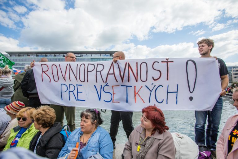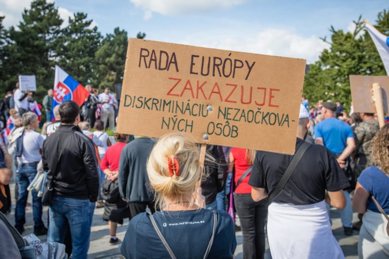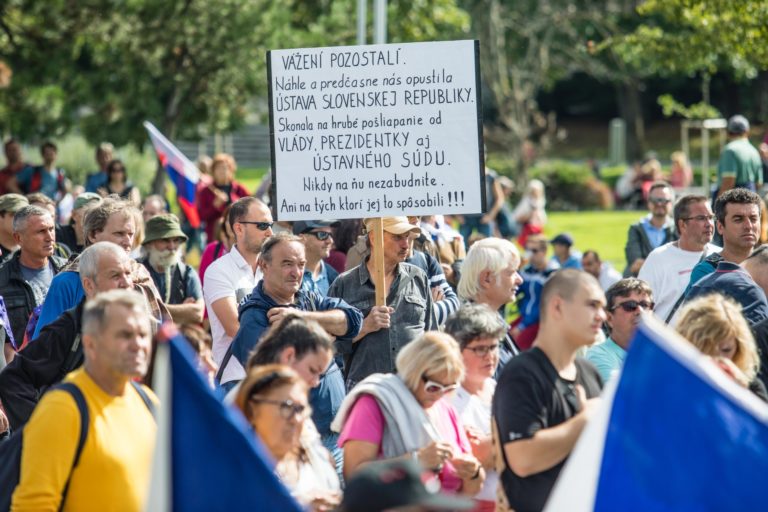 Účastníci počas protestu proti vláde, prezidentke SR a opatreniam v súvislosti s COVID-19 na Námestí slobody pri príležitosti štátneho sviatku Dňa Ústavy SR. Bratislava, 1. september 2021. Foto: SITA/Jana Birošová