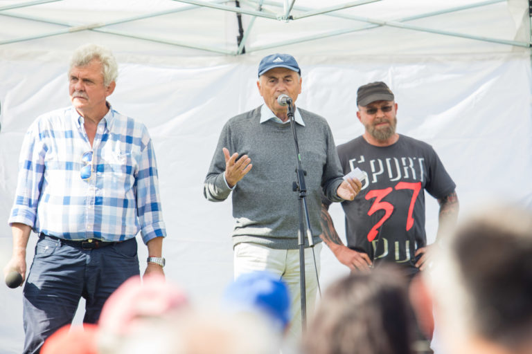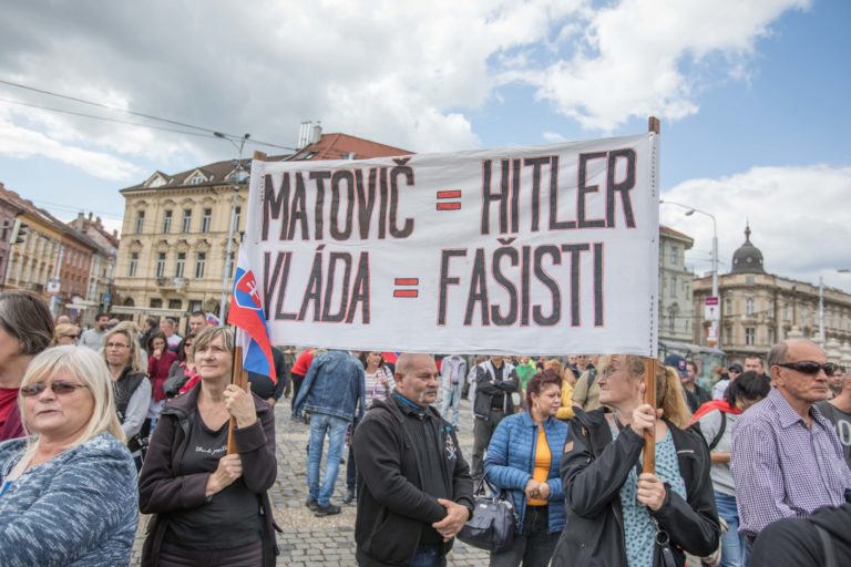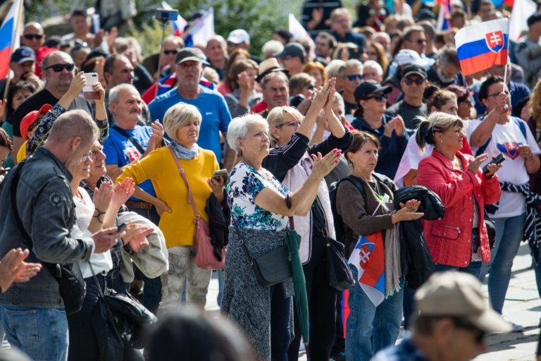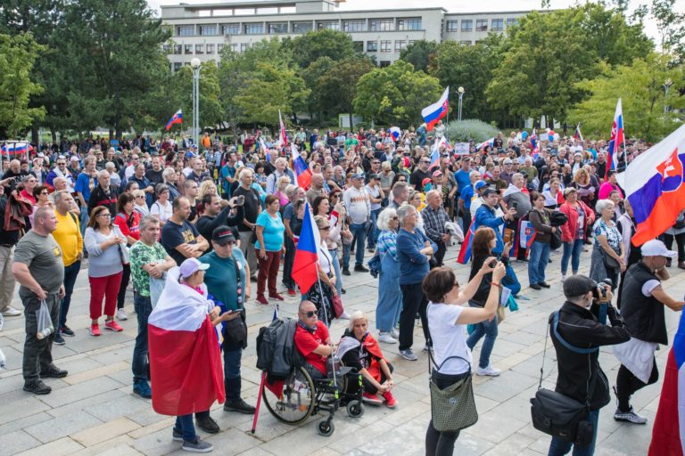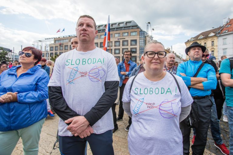 Účastníci počas protestu proti vláde SR, prezidentke SR a opatreniam v súvislosti s COVID-19 na Námestí slobody v Bratislave pri príležitosti štátneho sviatku Dňa Ústavy SR. Bratislava, 1. september 2021. Foto: SITA/Jana Birošová