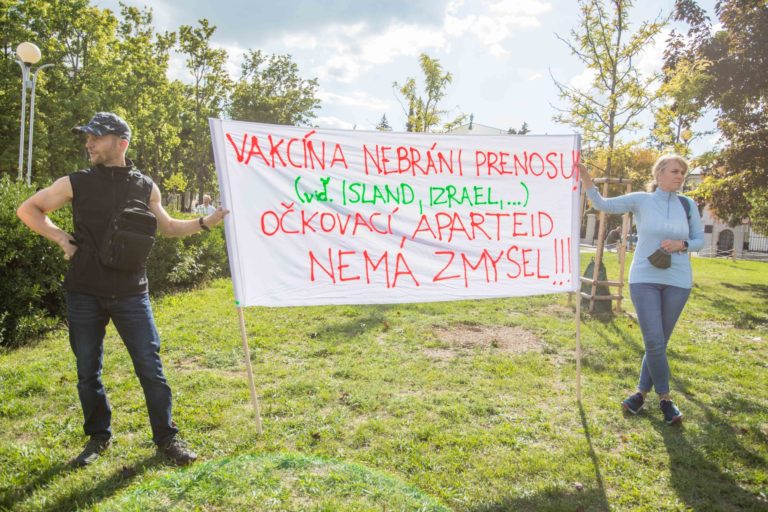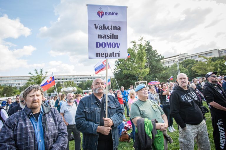 Účastníci počas protestu proti vláde, prezidentke SR a opatreniam v súvislosti s COVID-19 na Námestí slobody v Bratislave pri príležitosti štátneho sviatku Dňa Ústavy SR. Bratislava, 1. september 2021. Foto: SITA/Jana Birošová
