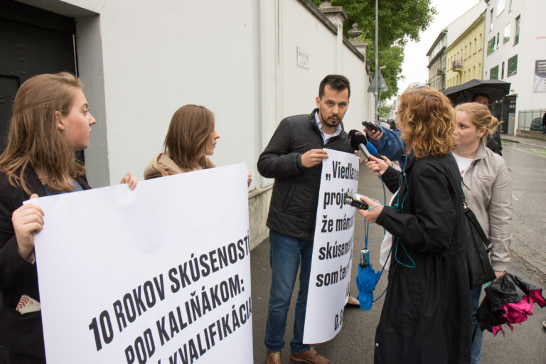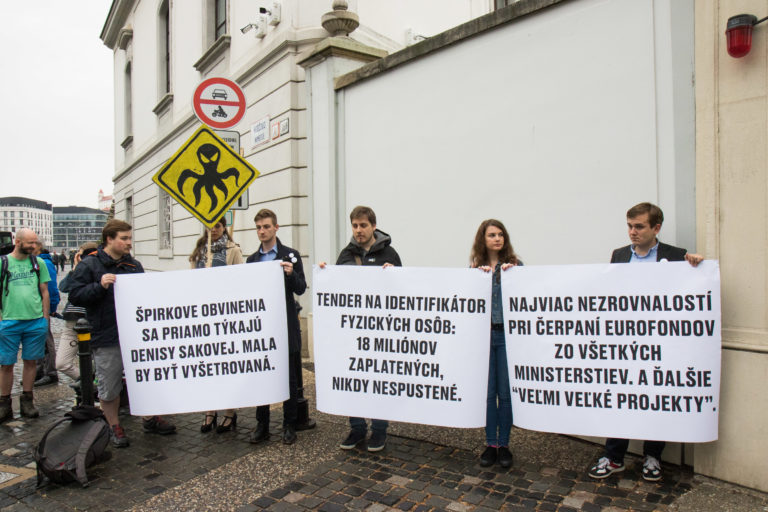 Juraj Šeliga (tretí zľava) z iniciatívy Za slušné Slovensko počas protestu pred Prezidentským palácom na ktorom vyjadrujú nedôveru Denise Sakovej pred jej menovaním do funkcie ministerky vnútra prezidentom SR. Bratislava, 26. apríl 2018. Foto: SITA/Ľudovít Vaniher.