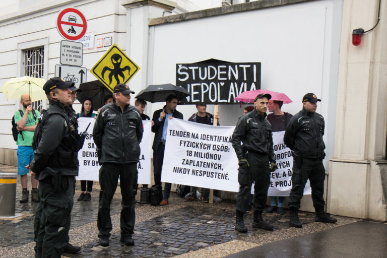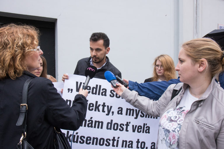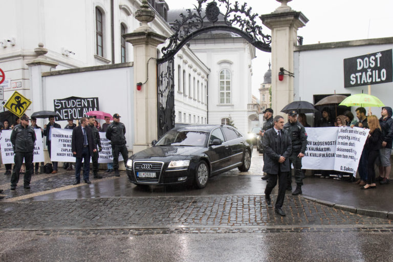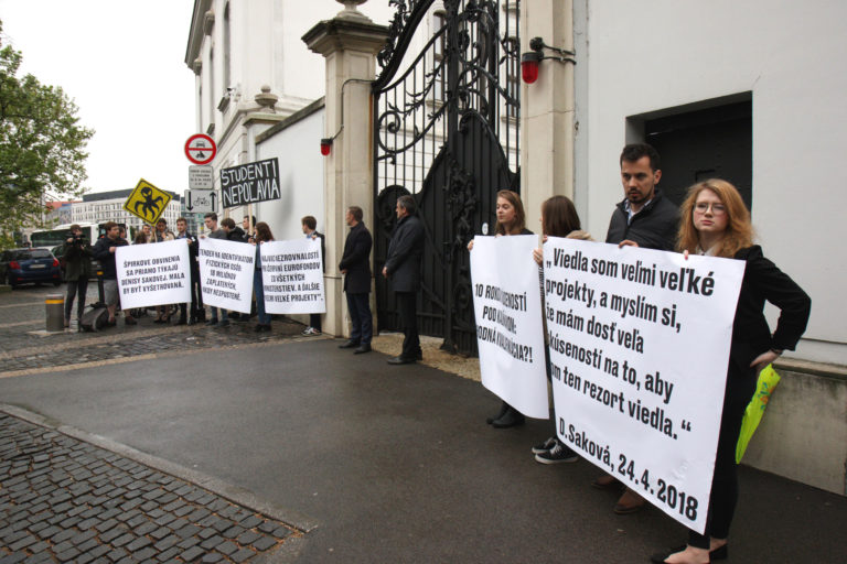 Účastníci protestu z iniciatív Za slušné Slovensko a Nie je nám to jedno, vyjadrujú pred Prezidentským palácom nedôveru Denise Sakovej pred jej menovaním do funkcie ministerky vnútra prezidentom SR. Bratislava, 26. apríl 2018. Foto: SITA/Ľudovít Vaniher.
