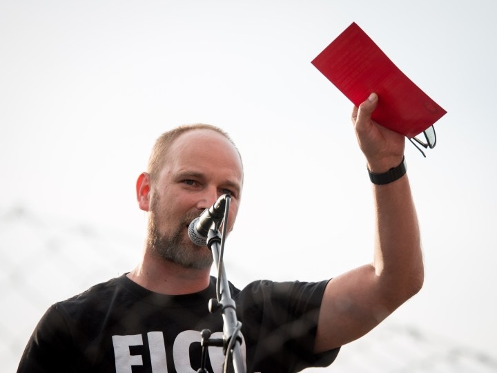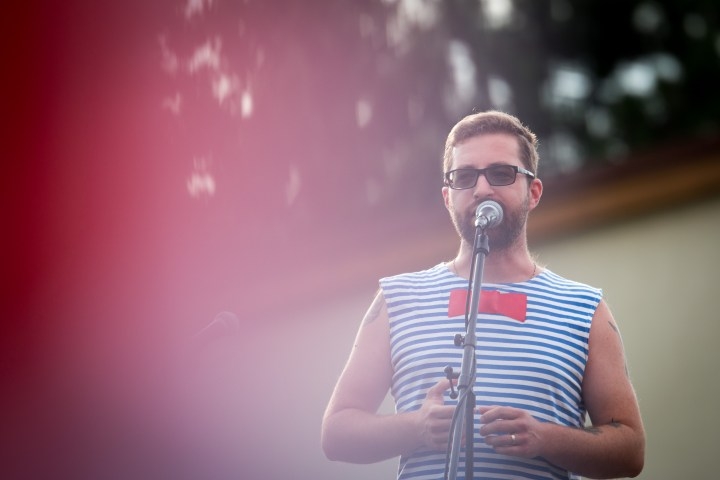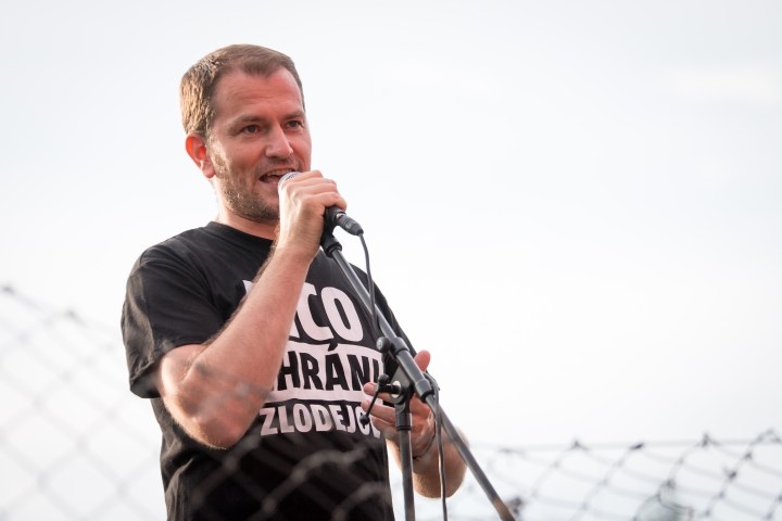 Poslanec za stranu SaS Martin Poliačik počas protestu pred bytovým komplexom Bonaparte. Protest proti zlodejom v politike zorganizovali opozičné strany SaS a OĽaNO. Bratislava, 1. august 2016. Foto: SITA/Marek Mrviš