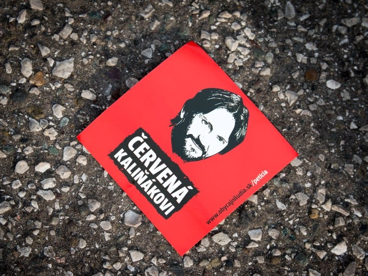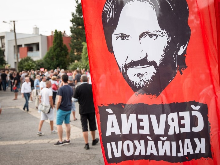 Pohľad na banner s vyobrazením tváre ministra vnútra Roberta Kaliňáka a nápisom: "Červená Kaliňákovi" počas protestu pred bytovým komplexom Bonaparte. Protest proti zlodejom v politike zorganizovali opozičné strany SaS a OĽaNO. Bratislava, 1. august 2016. Foto: SITA/Marek Mrviš