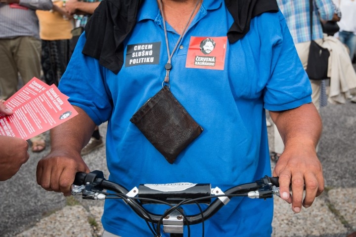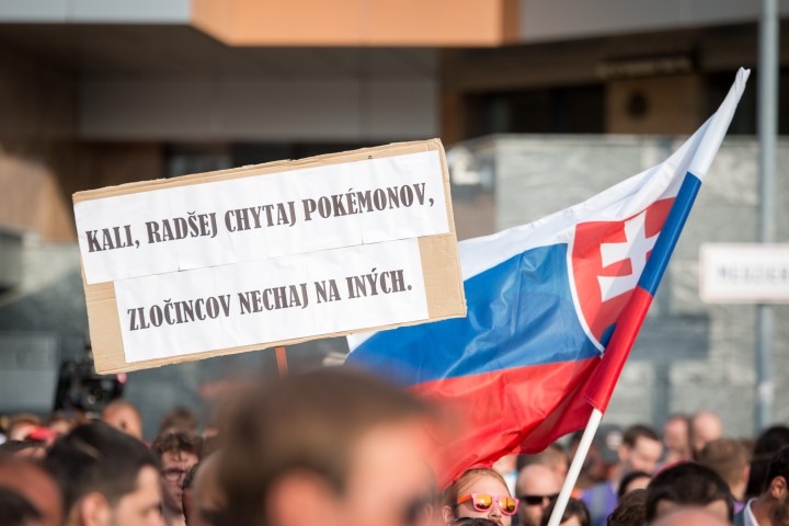 Pohľad na účastníka protestu pred bytovým komplexom Bonaparte. Protest proti zlodejom v politike zorganizovali opozičné strany SaS a OĽaNO. Bratislava, 1. august 2016. Foto: SITA/Marek Mrviš