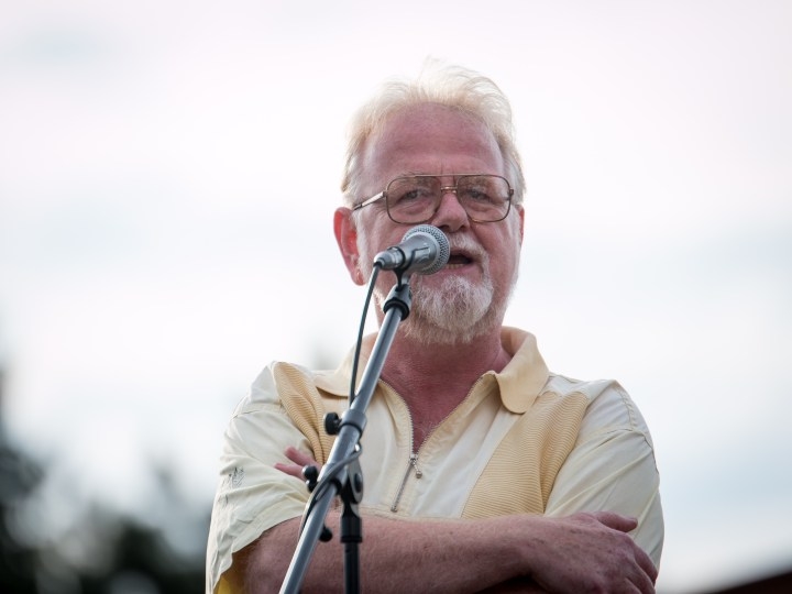 Poslanec za stranu OĽaNO Jozef Viskupič počas protestu pred bytovým komplexom Bonaparte. Protest proti zlodejom v politike zorganizovali opozičné strany SaS a OĽaNO. Bratislava, 1. august 2016. Foto: SITA/Marek Mrviš