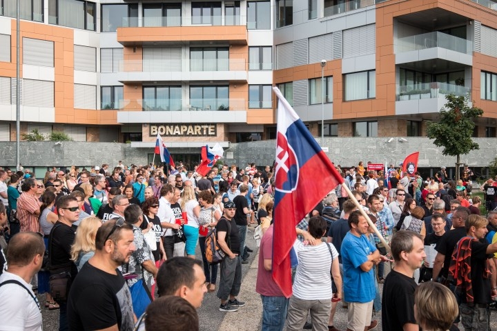 Účastníci protestu pred bytovým komplexom Bonaparte. Protest proti zlodejom v politike zorganizovali opozičné strany SaS a OĽaNO. Bratislava, 1. august 2016. Foto: SITA/Marek Mrviš