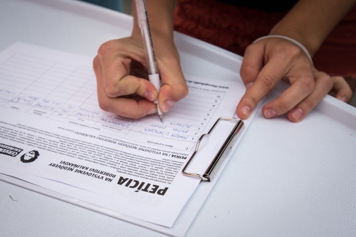 Petícia za odvolanie ministra Roberta Kaliňáka počas protestu pred bytovým komplexom Bonaparte. Protest proti zlodejom v politike zorganizovali opozičné strany SaS a OĽaNO. Bratislava, 1. august 2016. Foto: SITA/Marek Mrviš