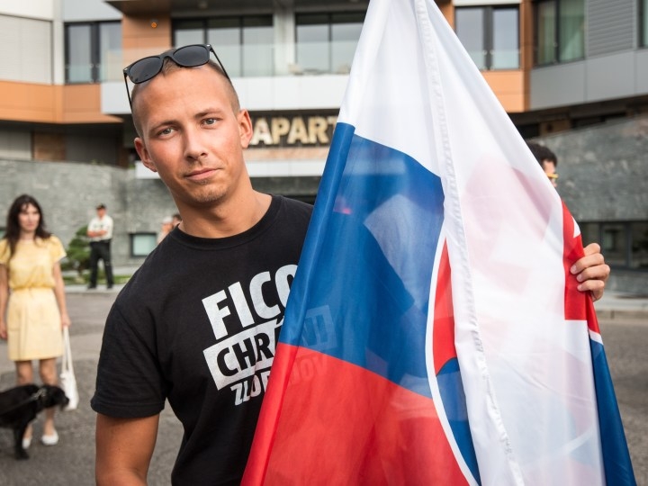 Účastník protestu s vlajkou Slovenskej republiky pred bytovým komplexom Bonaparte. Protest proti zlodejom v politike zorganizovali opozičné strany SaS a OĽaNO. Bratislava, 1. august 2016. Foto: SITA/Marek Mrviš
