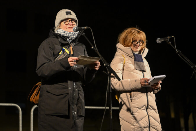 Zľava: Lucia Stasselová a Viera Dubačová z hnutia Nahnevané ženy počas protestného zhromaždenia s názvom Nahnevané ženy na Námestí Slobody v Bratislava. Bratislava, 15. december 2025. Foto: SITA/Milan Illík